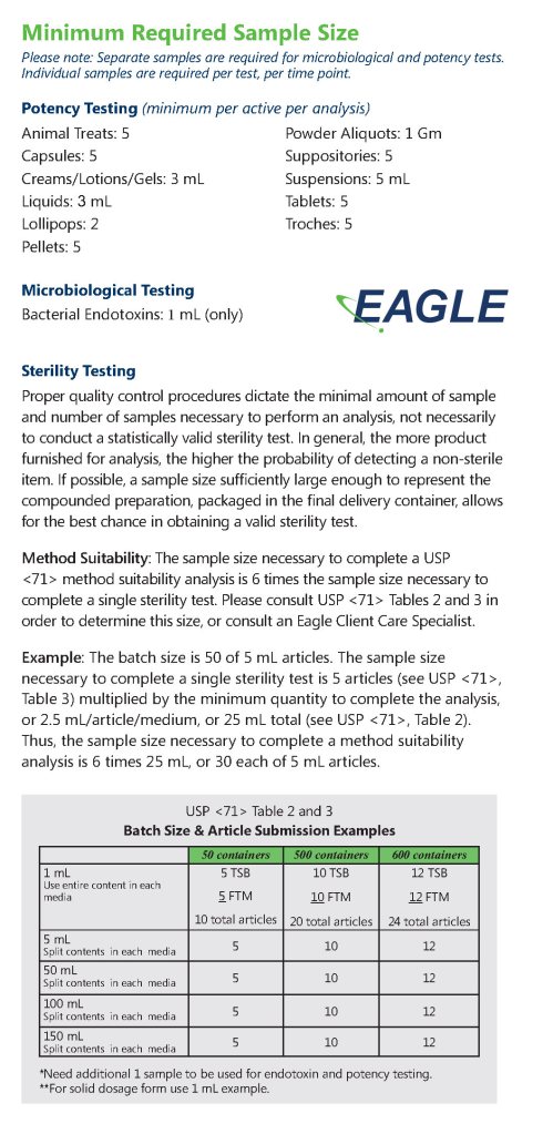 Samples for sterility testing should be sent in the dispensing container. Suspensions require a separate sample for microbiological and chemical tests. Please send two (2) separate sample containers if requesting potency and microbiology analysis on the same sample.